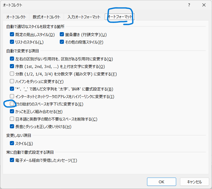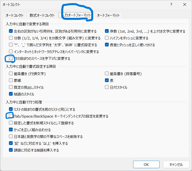 →「日本語と英数字の間の不要なスペースを削除する」オフ【オートフォーマット・タブ】